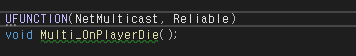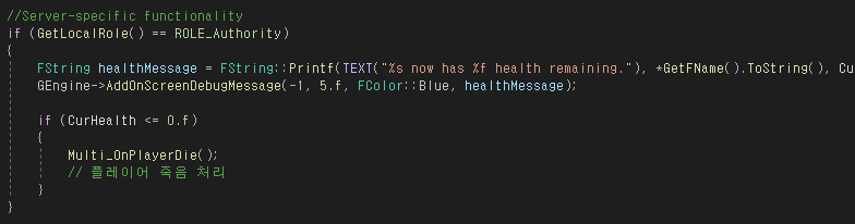 서버 쪽 캐릭터가 데미지를 입을 때 OnHealthUpdate 함수가 호출되기 때문에 내부에서 CurHealth <= 0 을 체크하여 멀티캐스트로 OnPlayerDie를 실행시킨다.