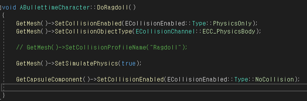 RagDoll 프리셋을 사용해도 되지만 RagDoll 프리셋은 Query도 허용하기 때문에 캐릭터가 죽은 이후에는 물리 시뮬레이션만 사용하고 싶기 때문에 CollisionEnabled와 ObjectType을 따로 지정해줬다.