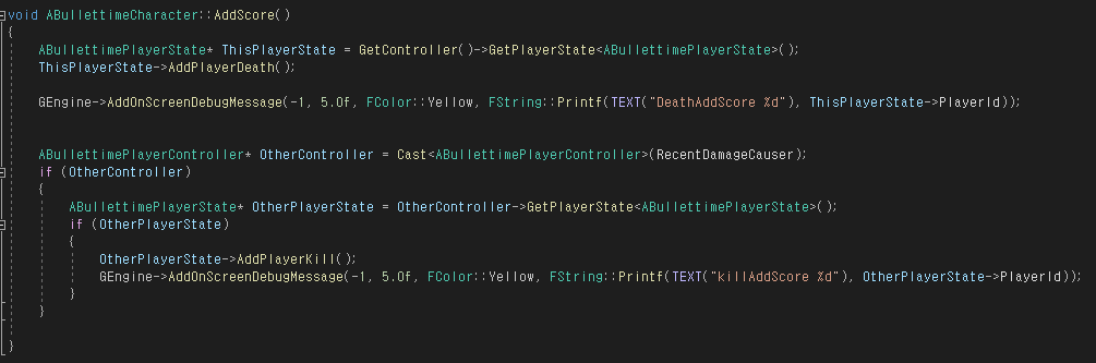 가장 최근에 이 캐릭터를 공격한 PlayerController 정보를 사용하여 각각의 캐릭터 컨트롤러가 가지는 PlayerState에 점수를 추가한다.