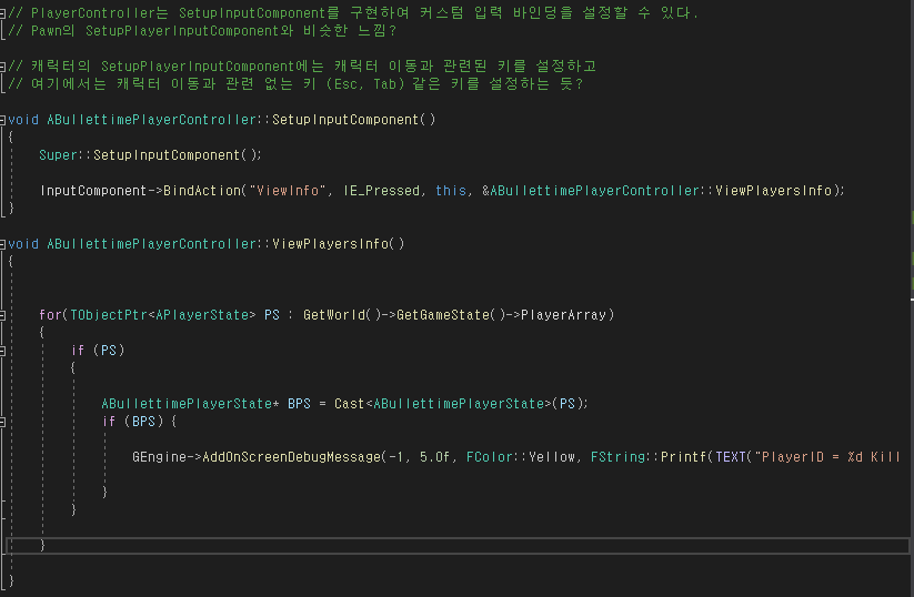 BullettimePlayerController를 새로 만들고 SetupInputComponent함수를 오버라이드 했다. tab키를 모든 플레이어 정보(이름 / 킬 / 데스)를 출력하는 함수에 바인딩했다.