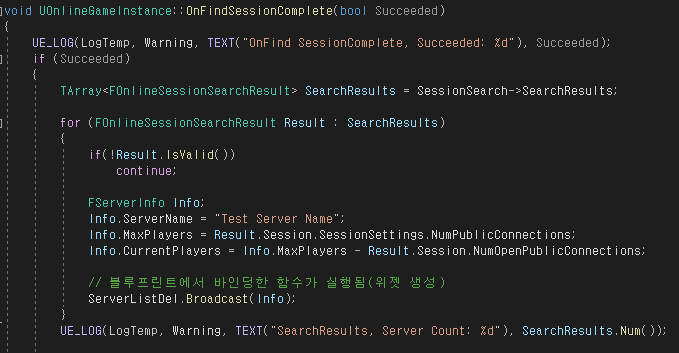 FindSession 이후 호출되는 OnFindSessionComplete에서는 FindSession의 결과로 얻은 FOnlineSessionSearchResult의 배열을 순회하면서 (검색된 세션의 개수만큼의 요소를 가지는 배열) ServerListDel를 브로드캐스트 해준다.