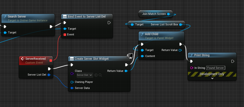 브로드캐스트 해줄 때마다 블루프린트에서 바인딩한 ServerReceived 커스텀 이벤트가 실행되어 위젯을 만들어주게 된다.