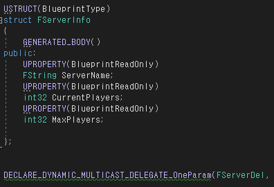 이 구조체 하나만을 인수로 갖는 다이나믹 멀티캐스트 델리게이트 FServerDel을 선언해준다.