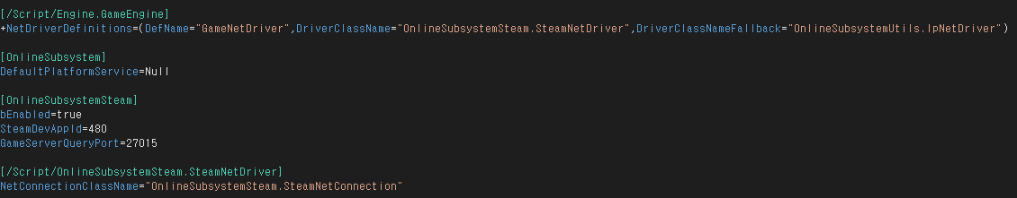DefeaultEngine.ini -> [OnlineSubSystem]의 DefaultPlatformService=Steam으로 설정
