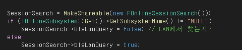 FindServer함수에서 SessionSearch의 bIsLanQuery = false 설정