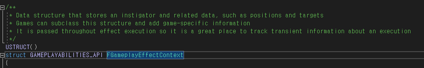 GAS에서 제공하는 기본 GameplayEffectContext 구조체에서 확장되어 GameplayCueNotifies에 전송할 추가 데이터 멤버와 함수를 정의한다.
