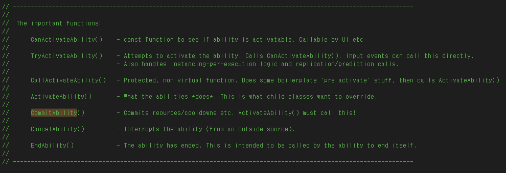 대부분의 라이라 Ability 블루프린트들은 ActivateAbility를 오버라이드 하여 ActivateAbility 내부에서 조건을 확인하고 조건에 따라 CommitAbility-EndAbility 혹은 EndAbillity 노드를 실행하는 방식인 것 같다.