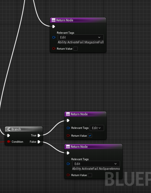 - 관련 아이템의 MagazineAmmo 스택 수를 확인합니다. 현재 탄창에 남은 탄약이 없다면, 태그를 적용하여 무기 발사 어빌리티 활성화를 억제합니다.