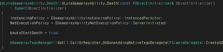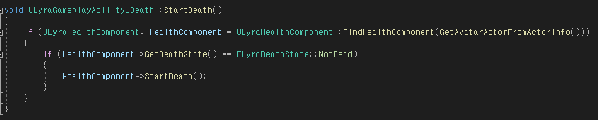 | ULyraGameplayAbility_Death | 사망 게임플레이 이벤트(Death Gameplay Event)를 트리거하기 위해 자동으로 구성됩니다. 모든 다른 어빌리티를 취소하고 폰의 체력 컴포넌트(Health Component)에 신호를 보내 나머지 게임 알림 및 스테이트 변경을 차례로 트리거하는 사망 프로세스를 시작합니다. 비주얼 이펙트는 이 클래스(GA_Hero_Death)의 BP 어빌리티 익스텐션에 의해 수행됩니다. |
