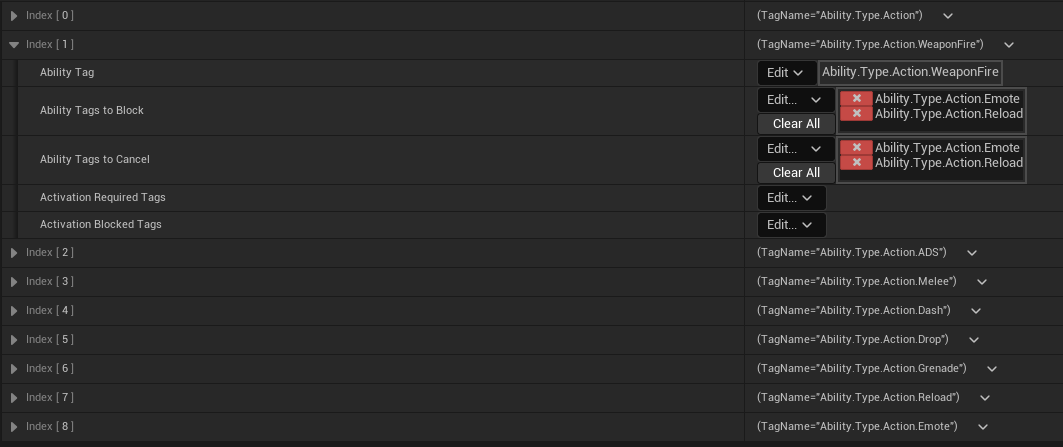Ability.Type.Action.WeaponFire 태그를 예시로 보면 이 태그가 활성화되어 있으면 Emote와 Reload가 Block되며,
