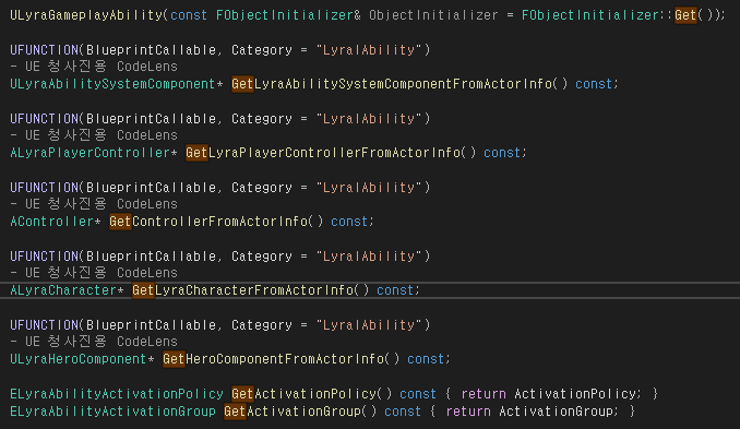 부모 클래스(Gameplay Ability)의 CurrentActorInfo에 접근하여 OwnerPlayerController, AbilitySystemComponent, AvatarActor, SkeletalComponent 등 오브젝트를 필요한 타입으로 캐스팅하여 반환한다.