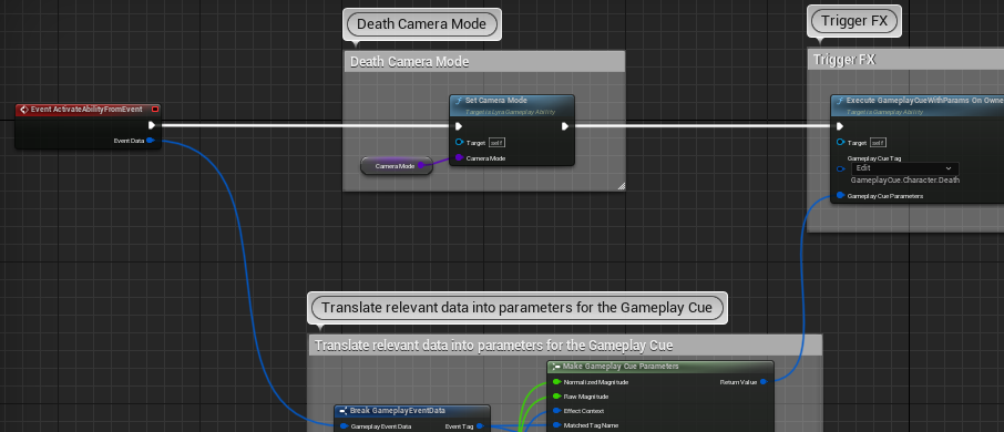 - 어떤 이유로든 이벤트가 처리되지 않았다면, 몽타주가 중지되거나 중단될 때 어빌리티가 로컬에서 종료됩니다. On End Ability 이벤트가 호출되어 활성화 시 설정된(앞서 설정된 경우) 사격 억제 태그를 제거합니다.