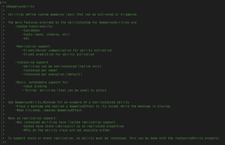 | UAbilitySystemComponent | 어빌리티 시스템 컴포넌트(Ability System Component, ASC) 는 모든 액터에 추가하여 GAS 함수 기능을 제공할 수 있습니다. 특정 액터의 스테이트를 추적하고 리플리케이션을 처리합니다. |