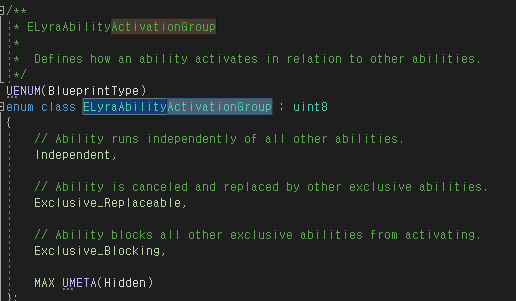 활성화 그룹(Activation Group)은 어빌리티가 자유롭게 활성화될 수 있는지 아니면 해당 어빌리티가 다른 전용 어빌리티를 차단하거나 중단할지를 결정한다. TagRelationship 애셋을 적용하여 복잡한 로직을 쉽게 적용할 수 있다.