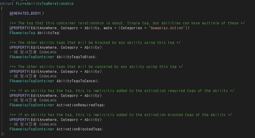 다음은 하나의 태그에 대한 관계 정보이다. FLyraAbilityTagRelationship이라는 구조체로 정의되어 있다.