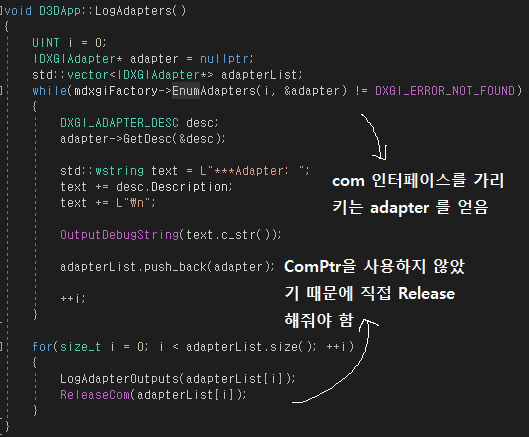 COM 인터페이스를 가리키는 포인터는 new 키워드로 직접 생성하지 않고 보통 특별한 함수를 호출해서 얻는다. (Comptr와 desc 구조체를 넘겨 COM 객체를 초기화한다)