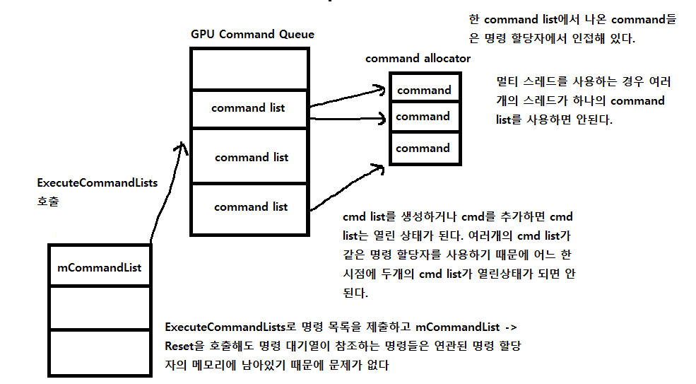 명령 대기열은 명령 목록에 담긴 명령 메모리 할당자(command allocator)를 참조한다. (명령 목록은 바로 reset 되어도 상관이 없음)