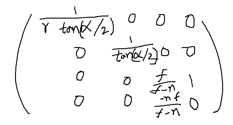 투영 변환은 카메라(화면)의 종횡비 r, 수직 시야각 α, 가까운 평면 거리(투영되는 창) n, 먼 평면 거리 f를 이용하여