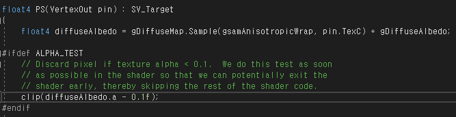 픽셀 셰이더에서 clip 함수를 사용하여 투명에 가까운 픽셀을 잘라낼 수 있다. (해당 픽셀에 대한 계산이 더 이루어지지 않는다.)
