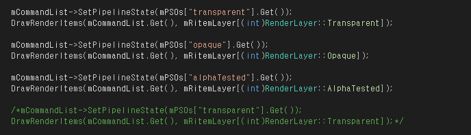 ㄴ 혼합 물체를 그릴때는 깊이 판정을 꺼야 한다. 혼합 물체에 의해 가려진 물체의 픽셀 단편이 제거되어 색이 날아가 버리기 때문이다.