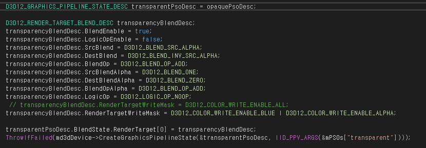 ㄴ D3D12_RENDER_TARGET_DESC 배열 렌더 대상마다 혼합을 다른 방식으로 할 경우 원소마다 다른 혼합 설정이들어간다. 렌더 대상들에 동일한 혼합 방식을 적용할 경우 0번 인덱스의 혼합 설정이 사용된다.