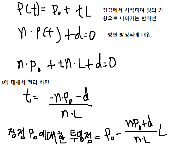 n과 L의 내적이 음수가 되어 (투영된 점의 w 성분이 음수가 되어) 절단되는 상황(시야 공간 바깥에 있는 판정)을 막기 위해서 L은 빛이 나아가는 방향의 반대 방향을 사용한다.