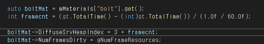 텍스처를 1 / 60초마다 변경하는 것은 gt.TotalTime()의 소수점 부분을 1 / 60 으로 나눠서 3번 ~ 62번중에 몇번 서술자를 쓸 것인지 지정하도록 만들었다.