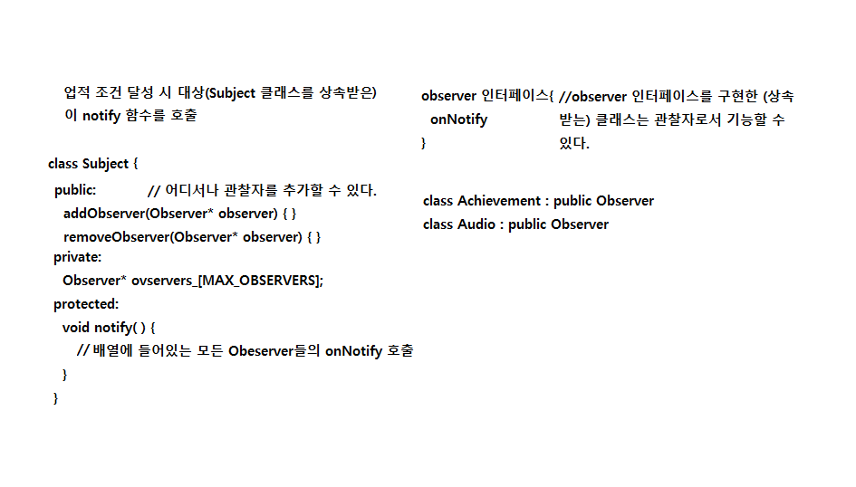 업적의 종류가 보통 광범위하기 때문에 단순하게 생각한다면, 업적의 조건을 만족하게 되는 부분에 업적 달성 함수를 호출하게 된다면 코드가 지저분해질 것이다.