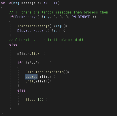 Update와 Draw 함수에 mTimer 객체를 넘겨줌으로써 시간 간격 차이를 이용해 게임 월드 상태를 진행할 수 있다.