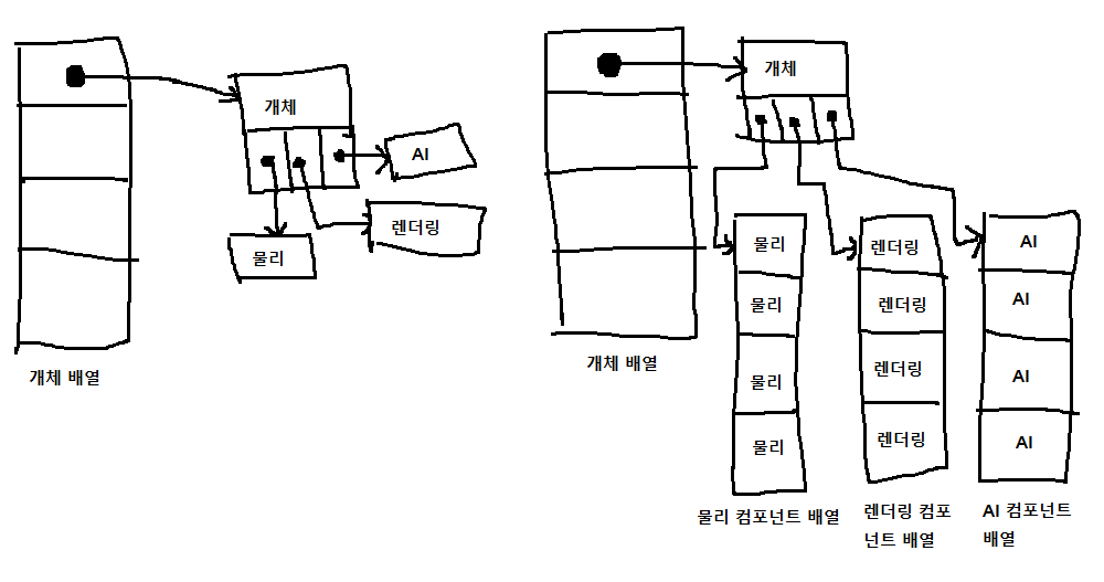 ㄴ 게임 개체는 컴포넌트가 실제로 어디에 있는지 신경 쓰지 않기 때문에, 컴포넌트들을 정렬된 배열에 둬서 순회 작업을 최적화할 수 있다.