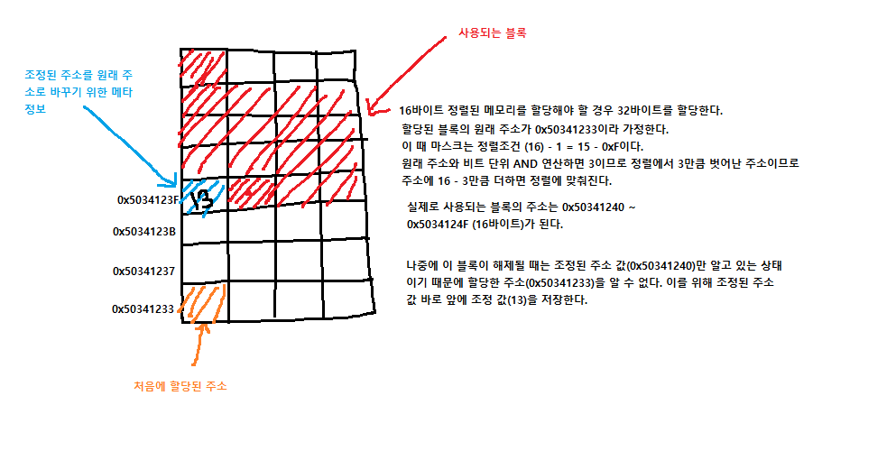 실제 요청된 것보다 조금 큰 메모리를 할당하고 블록의 주소를 살짝 위로 조정해서 정렬을 맞춘 다음 정렬된 주소를 리턴하면 된다.