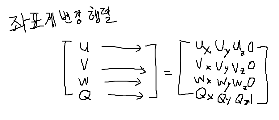 동촤 좌표 (Homogeneous coordinate) : 점과 벡터에 대한 변환을 동일한 방식으로 다룰 수 있다.